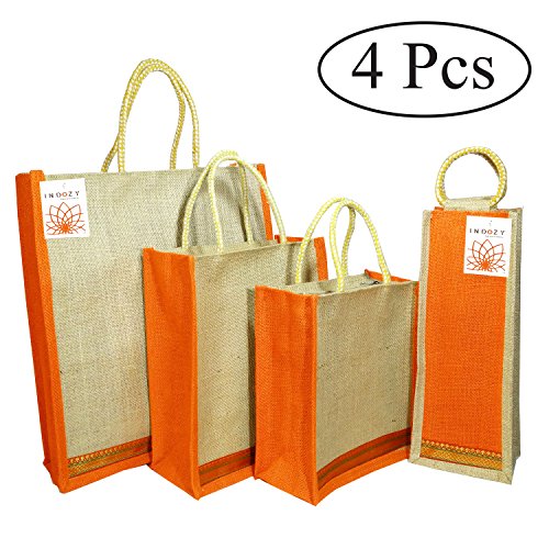INDOZY Jute Carry Bags for Multipurpose home use | Shopping bag | 4 Mixed combo | with Zip for Men Women Office uses| Reusable Eco-Friendly | Value for money Pack with Quality Laminated Burlap Hand-Bag 4 Units combo (Small+ Medium+Large+Bottle Bag)||