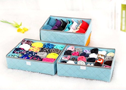 House of Quirk Set of 3 Foldable Charcoal Underwear Storage Drawer Organizer - (7-Cell,16-Cell And 24-Cell) - Blue||