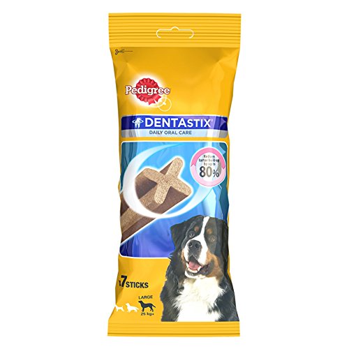 | 4 of 4 people found the following review helpful Verified Purchase(What is this?) This review is from: Pedigree Dentastix Large Breed Dog - Oral Care, 270 g Weekly Pack (7 Sticks) (Grocery) My dog adores this stick. I use it as a treat and it also makes his breath smell fresh. These are not hard treats so they are easy for a senior dog to chew. I give him 1 stick in 2-3 days and it has really helped with his dental hygiene.I would highly recommend it for your dog if he/she is averse to brushing his teeth often. This is not a substitute for brushing though, so that needs to be kept in mind. But all in all a great supplement. 2 of 2 people found the following review helpful Verified Purchase(What is this?) This review is from: Pedigree Dentastix Large Breed Dog - Oral Care, 270 g Weekly Pack (7 Sticks) (Grocery) My pet loves it and keeps asking for more. She has stopped eating other chewsticks. Dentastix is chewable and soft. Need to buy atlest 4 packs of these for month. But it is too pricey for so few sticks. I hope manufacturers take a note of it and add double sticks in pack if not more. After all we love to see happiness in our pets eyes and dentastix surely brings it. Verified Purchase(What is this?) This review is from: Pedigree Dentastix Large Breed Dog - Oral Care, 270 g Weekly Pack (7 Sticks) (Grocery) My dogs absolutely love it AND it's healthy for their teeth so that's a great product! I made a good decision in subscribing to this. Now I can treat them with this healthy treat every time they obey and sit there wagging their tails expecting rewards :) I recommend it to all fellow pet owners. I am giving 1 star less because I feel it should be priced lower. It's way too expensive at current price point. I don't mean Amazon should reduce the price, I'm sure they are giving all the discounts they can afford, I mean the Company (Mars International) should bring the price lower of this Pedigree product and make it more affordable. Just my view. I have subscribed anyway though because my dogs happiness is worth it for me :) |