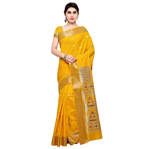 Varkala Silk Sarees Women's Raw Silk Paithani Saree With Blouse Piece(NYJB5012GD_Yellow_Free Size)